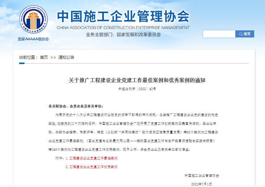 为展示党的十八大以来工程建设行业在党的领导下取得的伟大成就,总结推广工程建设企业党的建设的先进经验,迎接党的二十大胜利召开,近日,中国施工企业管理协会组织开展了工程建设企业党建工作优秀案例评审工作,雷火网页版页面登录第六分公司党支部的《塑品牌抓活动促活力 切实提升党建工作水平》案例获评“工程建设企业党建工作优秀案例”。